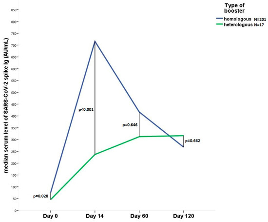 Line diagram shows the change in the median anti SARS-CoV-2 IgG level 14, 60 and 120 days after heterologous (N = 17) or homologous (N = 201) booster vaccination. Day 0, immediately before 3rd dose.