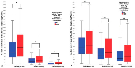 Correlation of antibody titers with syptomatic status after the 2nd and 3rd vaccinations. (A) Antibody response of symptomatic versus non-symptomatic patients at 14 (N = 383), 60 (N = 320) and 120 (N = 268) days after the 2nd vaccination, (B) after the 3rd dose (N = 218 at all time points). Definition of a symptomatic individual: A local or systemic adverse reaction occurring within 7 days after vaccination. Statistical analysis was performed using Mann–Whitney-U test in each group, respectively. NS, non-significant; SARS-CoV-2, severe acute respiratory syndrome coronavirus 2. * indicates p < 0.05.