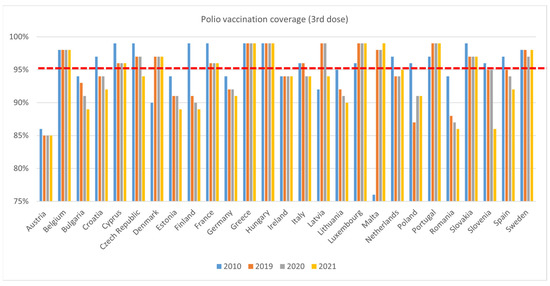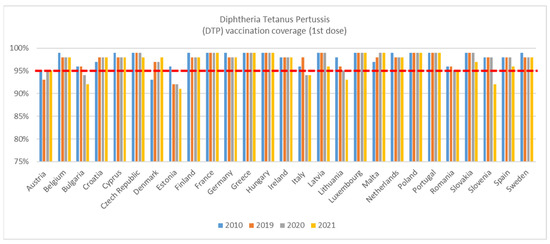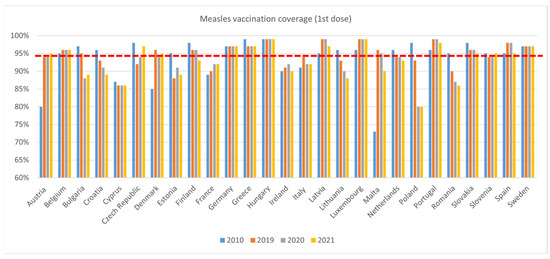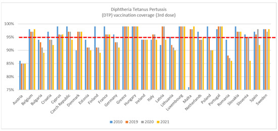 Analysis of primary data extracted from an externally available dataset was conducted in July 2022. This included vaccination coverage data from all 27 EU Member States between 2010 and 2021. Coverage rates per vaccine are framed in the context of the 95% vaccination coverage threshold needed to prevent vaccine-preventable outbreaks and reach “herd immunity”, as recommended by WHO [13,14]. Unless otherwise specified, all vaccination coverage data in this review is based on the WHO/UNICEF/Joint Estimates of National Immunisation Coverage (WUENIC) data [15]. When WUENIC data was unavailable, other comparable data was utilised (e.g., based on other available WHO data or official national datasets).