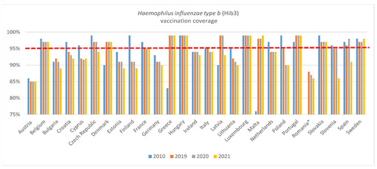 Hib3 coverage (Figure 3) was lower in 2019 than in 2010 in sixteen countries (Austria, Belgium, Croatia, Cyprus, Czech Republic, Estonia, Finland, France, Germany, Lithuania, The Netherlands, Poland, Slovakia, Slovenia, Spain, and Sweden). Between 2019 and 2020, VCRs remained consistent in most EU countries. It dropped in six countries (Bulgaria, Croatia, Italy, Lithuania, Poland, and Romania), and increased only in Spain. Hib3 coverage rates remained constant between 2019 and 2021 in eleven countries (Austria, Belgium, Cyprus, Denmark, France, Greece, Hungary, Luxembourg, The Netherlands, Portugal, and Slovakia). For twelve countries, VCRs declined in 2021 compared to 2020 (Bulgaria, Croatia, Czech Republic, Estonia, Finland, Germany, Ireland, Latvia, Lithuania, Romania, Slovenia, and Spain). They increased in 2021 only for Malta and Sweden.