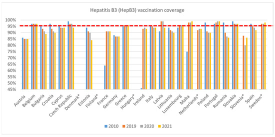Analysis of primary data extracted from externally available datasets was conducted in July 2022. The analysis included vaccination coverage data in all 27 EU Member States between 2010 and 2021. All vaccination coverage data in this brief is based on the WHO/UNICEF Joint Estimates of National Immunisation Coverage (WUENIC) data, unless otherwise indicated. Where WUENIC data was unavailable, other comparable data was used, based on other available WHO data or official national datasets, such as from national Ministries of Health. WUENIC (WHO/UNICEF), Immunisation data; The Netherlands HepB vaccination coverage, 2010 source: WHO, Immunisation data—OFFICIAL; Slovenia HepB vaccination coverage: a different source was used for 2019 and 2020 data: WHO, Immunisation data—OFFICIAL; Sweden HepB vaccination coverage: a different source was used for 2010 data: Swedish Institute for Infectious Disease Control, Vaccinationsstatistik från barnavårdscentralerna, insamlad januari 2010, gällande barn födda 2007, 2010; Italy measles 2nd dose vaccination coverage data: a different source was used for 2010–2012 data: Ministero della salute, Vaccinazioni dell’età pediatrica—Anno 2010; Finland: a different source was used for 2011–2013 data: Finnish Institute for Health and Welfare, THL, Vaccination coverage in children; Ireland measles 2nd dose vaccination coverage data, 2011–2020 based on school year, Health Protection Surveillance Centre.