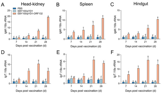 mRNA expression levels of IgM and IgT in the head–kidney (A,D), spleen (B,E), and hindgut (C,F) after the oral vaccination. Bars with different letters were significantly different according to Duncan’s multiple range (p < 0.05).