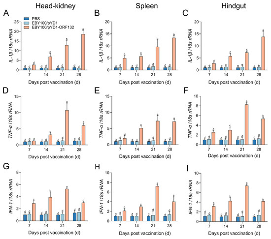 mRNA expression levels of IFN-1, TNF-α, and IL-1β in the head–kidney (A,D,G), spleen (B,E,H), and hindgut (C,F,I) after the oral vaccination. Bars with different letters were significantly different according to Duncan’s multiple range (p < 0.05).