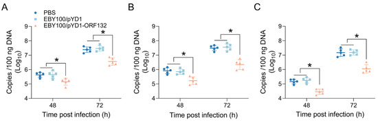 To further examine the influence of oral vaccine on virus load, we analyzed the copy of CyHV-2 in the head–kidney, spleen, and hindgut post infection. As shown in Figure 6, CyHV-2 was detected in all selected tissues, and the virus load in the hindgut was lower than that in the head–kidney and spleen. In addition, the virus load increased with the infection time. Compared with the PBS and EBY100/pYD1 groups, the CyHV-2 load was significantly suppressed in the EBY100/pYD1-ORF132 group. The results suggested that oral immunization with EBY100/pYD1-ORF132 could effectively suppress the replication of CyHV-2.