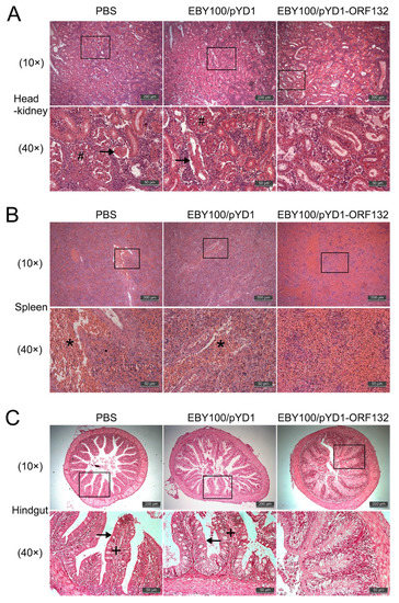Histopathological examination was utilized to explore the effect of an oral vaccine on the histopathology of the tissues in CyHV-2-infected fish. Head–kidney, spleen, and hindgut samples were collected for histological analysis 2 days post CyHV-2 infection. In the head–kidney of PBS and EBY100/pYD1 groups, the renal tubular epithelia were separated from the basal lamina. Necrotic foci and organized shrinking were observed in tubular epithelial cells (Figure 7A). Additionally, diffuse congestion was observed in the spleen of PBS and EBY100/pYD1 groups (Figure 7B). However, no serious damage or minor lesions were observed in the EBY100/pYD1-ORF132 group. In the hindgut of PBS and EBY100/pYD1 groups, villi atrophy and an abnormal increase in goblet cells was observed (Figure 7C). Therefore, our results indicated that vaccination with EBY100/pYD1-ORF132 relieves the tissue damage caused by CyHV-2 infection.