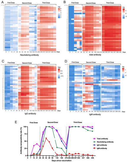 Anti-SARS-CoV-2 antibody response to the vaccines for 32 participants. Heatmaps of the kinetics of anti-SARS-CoV-2 neutralizing antibodies (A), anti-SARS-CoV-2 total antibodies (B), anti-SARS-CoV-2 IgG antibodies (C), and anti-SARS-CoV-2 IgM antibodies (D) induced by a three-dose regimen of vaccination. (E) Seropositivity rate for the four subsets of anti-SARS-CoV-2 antibodies.