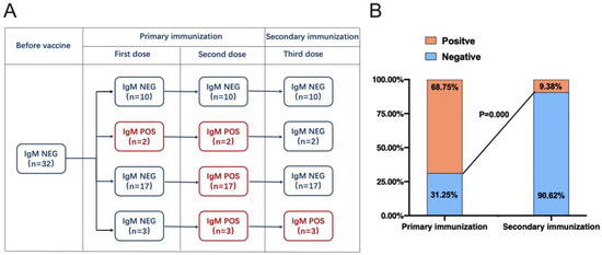 To better evaluate the response of anti-SARS-CoV-2 IgM antibodies after each of the three doses, positive conversion was longitudinally investigated. There were 10 (31.25% (10/32) (95% CI, 14.30–48.20%)) participants who never achieved positive conversion after vaccination during the three-dose regimen. Their IgM response was minimal after the third dose. Notably, 19 (86.36% (19/22) (95% CI, 70.80–100.00%)) of the participants who had achieved positive conversion after the second dose did not exhibit positive conversion again after the third dose (Figure 2A). According to serial immunization, the seropositivity response rate was 68.75% (22/32) (95% CI, 51.80–85.70%) after primary immunization. Unexpectedly, after secondary immunization, the seropositivity response rate was only 9.38% (3/32) (95% CI, 1.30–20.10%), which was much lower than the seropositivity response rate after primary immunization (p = 0.000) (Figure 2B), indicating that the secondary response was suppressed by primary immunization.