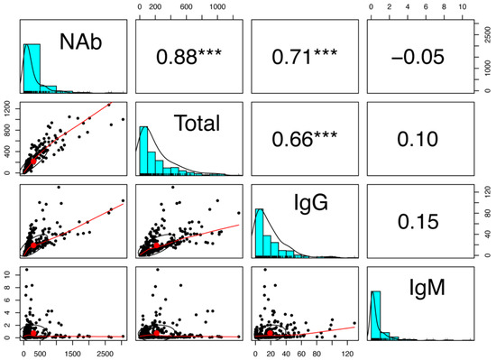 The above results indicated that anti-SARS-CoV-2 IgM antibodies showed a low secondary response which was different from the other three antibodies, neutralizing, total, and IgG antibodies. Spearman’s correlation analysis was further conducted to analyze correlations between the four anti-SARS-CoV-2 antibodies. There was a strong correlation between anti-SARS-CoV-2 neutralizing and anti-SARS-CoV-2 total antibodies (r = 0.88; p < 0.001), and between anti-SARS-CoV-2 neutralizing and anti-SARS-CoV-2 IgG antibodies (r = 0.71; p < 0.001). A moderate correlation was also observed between anti-SARS-CoV-2 total and anti-SARS-CoV-2 IgG antibodies (r = 0.66; p < 0.001). However, anti-SARS-CoV-2 IgM antibodies showed a poor correlation with the other three antibodies, neutralizing, total, and IgG antibodies (r = −0.05~0.15; p > 0.05). In general, IgM response was different from those of the other three antibodies after prolonged inoculation (Figure 3).