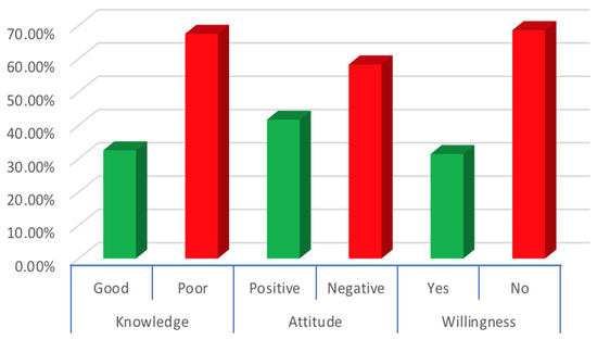 As shown in Table 4, various factors significantly affect willingness to be vaccinated. These include gender (p = 0.027), information on monkeypox during medical education (p = 0.001), more worried about monkeypox compared to COVID-19, and history of COVID-19 infection (p = 0.021). Nearly one third (31.4%) of the physicians planned to be vaccinated, and 85 (30.0%) refused to be vaccinated against monkeypox infection. When the government offered the vaccination for free, 145 (51.2%) of the participants were willing to be vaccinated. Additionally, a significantly higher willingness rate was observed during chi-square analysis for the participants with better knowledge levels than the poor knowledge-categorized people (47.8% vs. 23.6%, p < 0.001), while the positive attitude was not significantly associated with the willingness (34.7% vs. 48.8%, p = 0.001)