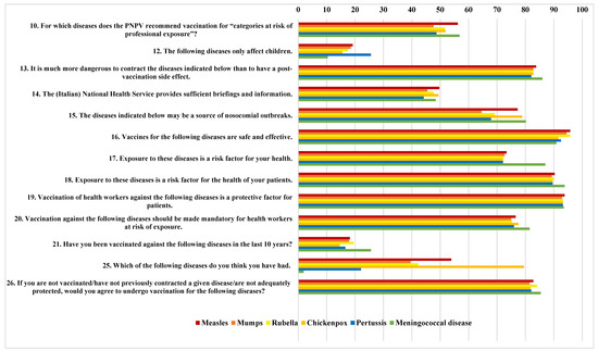 Most respondents reported having contracted chickenpox and measles. Around 20% of our respondents reported having been vaccinated against diseases considered in the last 10 years. The highest vaccination level was for meningococcal disease (27%). Residents and nurses were more likely to have been vaccinated. There were also statistically significant differences in relation to age group. Occupation and age are often reported in the literature as predictive factors for vaccination coverage [26,36,37,48]. Protection of personal health was the main motivation for vaccination in our sample, as also reported in other studies on vaccine recommendations [29,31,49,50].