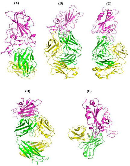 Cartoon representation of crystal structures of spike protein RBD in complex with monoclonal antibodies (mAbs): (A) REGN10933 [25] (PDB ID: 6xdg), (B) BD368-2 [26] (PDB ID: 7chf), (C) S2M11 [27] (PDB ID: 7k43), (D) EY6A [28] (PDB ID: 6zcz), and (E) JMB2002 [21] (PDB ID: 7wrv). RBD is shown in magenta, antibody heavy chain (HC) in green, and antibody light chain (LC) in yellow.