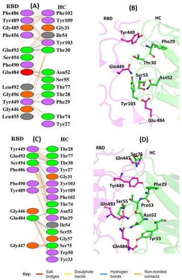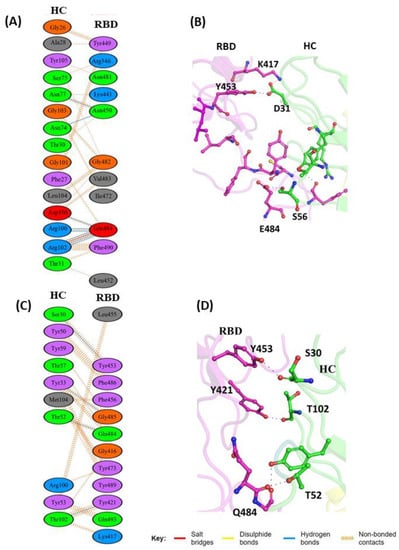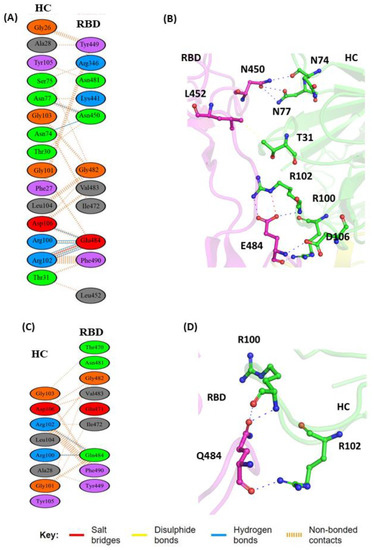 Protein–protein interaction between RBD with REGN10933 antibody: (A) 2D interaction diagram of binding interface of WT-RBD with REGN10933 antibody; (B) 3D cartoon representation of intermolecular interaction of E484 residue of RBD with heavy chain (HC) of REGN10933 antibody; (C) 2D interaction diagram of binding surface of MT-RBD with REGN10933 antibody; (D) 3D cartoon representation of intermolecular interaction of E484 residue of RBD with heavy chain of REGN10933 antibody. Here, only intermolecular interactions are shown. RBD represents receptor-binding domain, while HC represents heavy chain of monoclonal antibody (mAb). The interacting residues are shown in sticks. RBD is shown in magenta cartoon, and HC is shown in green color as a residue of mAbs (Figure 2B). In the MT-RBD-REGN1093 complex, the replacement of the hydrophobic Leu (L) residue with positively charged polar Arg (R) residue abolishes the intramolecular hydrophobic contact with L490 (Figure S1A,B), while the substitution of Glu (E484), which has a polar acidic side chain with Gln (Q), results in the formation of a new hydrogen bond interaction with T52 and Y33 residues of HC. The key salt bridge interaction of K417 in RBD with D31 (HC region) was found to be lost in the MT-RBD complex (Figure 2C,D). The WT-RBD complex with REGN10933 displayed additional stabilizing interactions as compared to the MT complex.