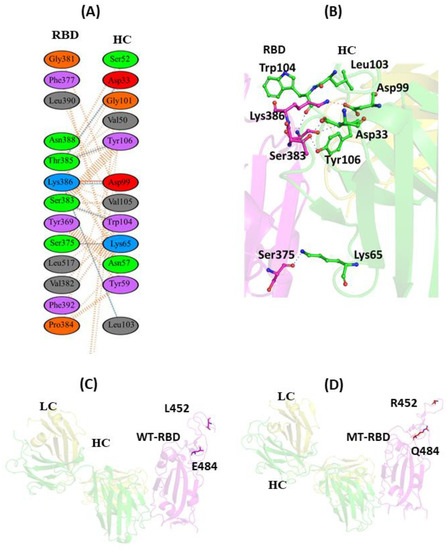 Protein–protein interaction of RBD with EY6A mAb: (A) 2D interaction diagram of binding interface of WT-RBD with EY6A antibody; (B) 3D cartoon representation of intermolecular interaction of E484 residue of RBD with HC of EY6A antibody; (C) cartoon representation of WT-RBD with EY6A antibody. The residues L452 and E484 are represented in sticks. These residues lie far away from EY6A binding site and do not participate in forming intermolecular contact with mAb; (D) Cartoon representation of MT-RBD with EY6A mAb. R452 and Q484 residues of RBD are shown in sticks. These residues also do not interact with EY6A antibody. RBD represents receptor-binding domain, HC represents heavy chain of monoclonal antibody, while LC represents light chain of mAb.