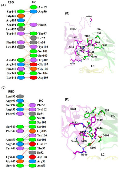 The cryo-electron microscopy (cryo-EM) [38] structure of the Fab region of REGN10933 reveals that it binds to the RBD from the topmost site and overlaps with the hACE2 binding site [38]. We studied the effect of the RBD double mutation on mAb binding by comparing the molecular interactions between the wild-type (WT) and mutated-type (MT) RBD complexes. The interfacial residues between the RBD and REGN10933 were analyzed in the post-MD complexes (Figure 2A,B). Several hydrogen bonds present between the heavy-chain (HC), complementarity-determining regions (CDRs) and the RBD, involving the HC residues D31, Y33, and T52 and the RBD residues K417, Y453, E484, F486, C488, and Y489 (Figure 2A). The complementarity-determining regions (CDRs) are the hypervariable domains of the Ab that determine the specific antibody interaction with the antigen molecule. The light-chain (LC) residues of the mAb are responsible for stabilizing the HC residues to facilitate the interaction with the RBD of the S protein. Here, we focused specifically on the co-mutant residues of the RBD, i.e., L452 and E484, and their induced local perturbations on the protein’s overall structure. The L452 (RBD) residue made key intramolecular hydrophobic interactions with L492 and F490 that constitute the hydrophobic patch on the surface of the RBD. The E484 residue forms intermolecular interactions with the HC of REGN10933 through the S56.