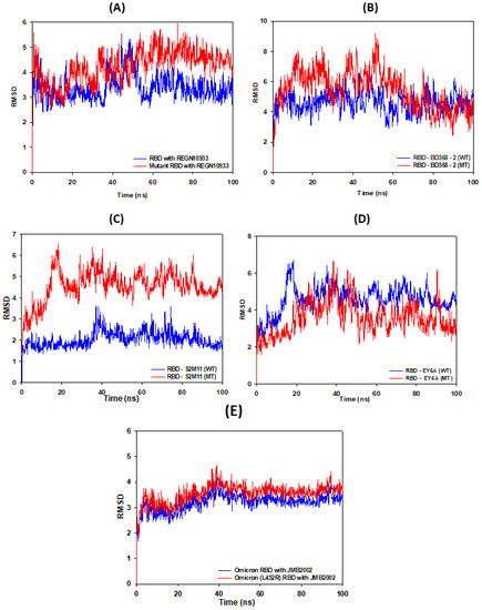 The root mean square deviation (RMSD) of wild-type (WT) and mutant-type (MT) RBD in presence of (A) REGN10933, (B) BD368-2, (C) S2M11, (D) EY6A, and (E) JMB2002 mAbs during 100 ns MD simulation run.