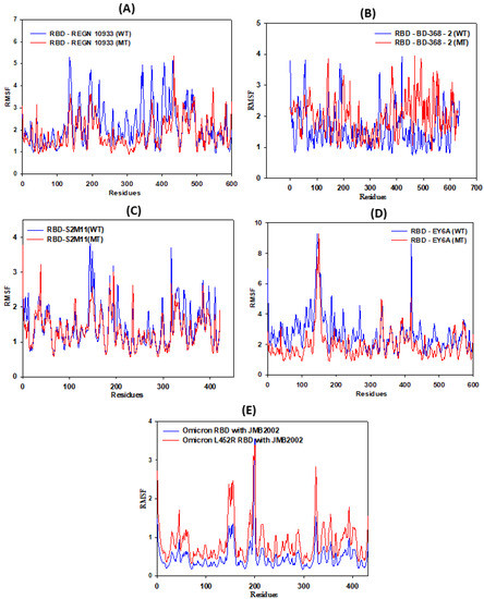 The root mean square fluctuation (RMSF) of wild-type (WT) and mutant-type (MT) RBD in presence of (A) REGN10933, (B) BD368-2, (C) S2M11, (D) EY6A, and (E) JMB-2002 mAbs during 100 ns MD simulation run.