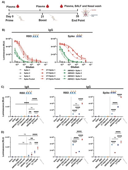 Humoral systemic responses from intranasal administration with adjuvanted RBD or spike antigens. (A) Experimental design: Balb/c mice were intranasally immunized with RBD or spike protein adjuvanted with CT or AMVAD mucosal adjuvant on days 0 and 21. Control groups include mice vaccinated with phosphate-buffered saline (PBS), protein alone (RBD or spike) and adjuvant alone (CT or AMVAD). Seven days post-boost, plasma, bronchoalveolar lavage fluids (BALF) and nasal wash were collected to assess humoral responses. (B) Evaluation of RBD- and spike-specific IgG titers in plasma of individual mice vs. pooled plasma collected at end point. (C) Measurement of RBD- and spike-specific IgA and IgG responses in plasma collected after first dose (day 20) (1/100 dilution) and (D) after second dose (day 35) (1/2000 dilution), analyzed by an indirect ELISA. Statistical significance was calculated by one-way ANOVA followed by Tukey correction; n.s.: no statistical difference; ** p ≤ 0.01, *** p ≤ 0.001, **** p ≤ 0.0001. Individual mice samples were pooled and analyzed in triplicate.