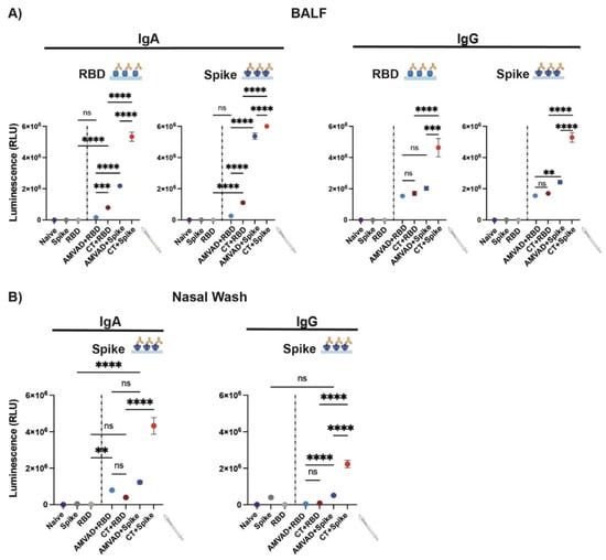 Antibody responses in BALF and the nasal cavity from intranasal administration with adjuvanted RBD or spike antigens. Measurement of RBD- and spike-specific IgA and IgG responses in (A) BALF and (B) nasal wash collected at end point. BALF was diluted 4- and 30-fold for measurement of IgA and IgG specific titers, respectively. Nasal wash was diluted four-fold. Statistical significance was calculated by one-way ANOVA followed by Tukey correction; n.s.: no statistical difference; ** p ≤ 0.01, *** p ≤ 0.001, **** p ≤ 0.0001. Individual mice samples were pooled and analyzed in triplicate.