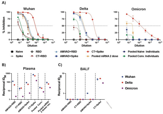Next, we compared the relative inhibition of ACE2–spike interactions by neutralizing antibodies in plasma and BALF for the ancestral, Delta and Omicron variants (Figure 4). We show that both adjuvanted RBD and spike formulations induced neutralizing antibodies in plasma against the spike proteins of Delta, but only CT–spike and, to a lesser extent, AMVAD + spike, induced the production of neutralizing antibodies against the spike of the Omicron variant (B.1.1.529) (Figure 4A,B). In particular, vaccination of mice with AMVAD-adjuvanted RBD or spike elicited superior inhibition of ACE2–spike interactions for Wuhan and Delta variants compared to natural SARS-CoV-2 infection in humans (i.e., pooled convalescent (pooled conv.); Alpha variant) and similar inhibition as pooled plasma from individuals vaccinated with two doses of the Pfizer mRNA vaccine (Figure 4A,B). Despite overall lower neutralization titers in BALF relative to levels observed in plasma, we showed that neutralization responses significantly correlated to IgA titers. Indeed, only spike-adjuvanted immunized mice showed weak but detectable neutralizing titers against SARS-CoV-2, with only CT + spike showing neutralizing activity against all the variants tested, while there was poor induction of mucosal neutralization with the adjuvanted RBD formulations (Figure 4C).