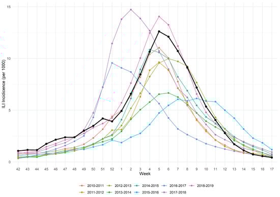 ILI incidence of 2019/2020 influenza epidemic (black line) along with 9 previous seasons.