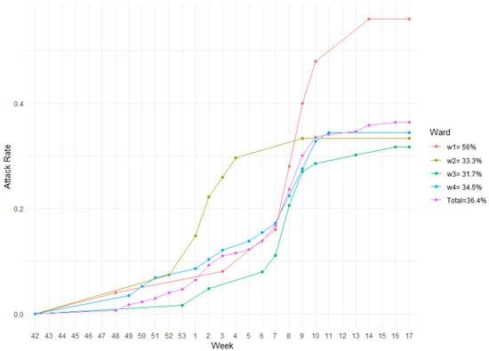 During the season, ward 1 hosted 25 individuals, the second 27, whereas the last two 63 and 58 respectively, for a total of 173 guests. Out of a total of 63 ILI cases, 14 belonged to ward 1, 9 to ward 2, and 20 cases were registered in each of the last two wards (w3 and w4). The aggregate AR of ILI in the nursing home during the 2019/2020 season was 36.4%. The highest AR was observed in ward 1 (56%), followed by ward 4 (34.5%) and ward 2 (33.3%). The least AR of 31.7% was relative to ward 3. Figure 2 shows the AR dynamics (cumulative incidence) of the nursing home during the study period. During the study period no COVID-19 cases were registered among the guests.