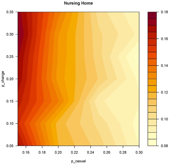 The total number of simulations performed for the model fit were 5600. Among all the explored values of p_casual and p_change, the configuration of parameters that minimized the whole structure root mean square error (RMSE) is p_casual = 0.3, p_close = 0.6, p_change = 0.2. The corresponding RMSE is 0.078. Figure 3 shows an heatmap of the explored values of p_casual and p_change. The values of p_close were fixed at double the values of p_casual. Moreover, we performed a sensitivity analysis with varying levels of the p_close/p_casual ratio (Text S1, Figure S5), which produced similar results. The results of the model fit for each ward are illustrated in Figure S2 in Text S1-Supplementary Materials.