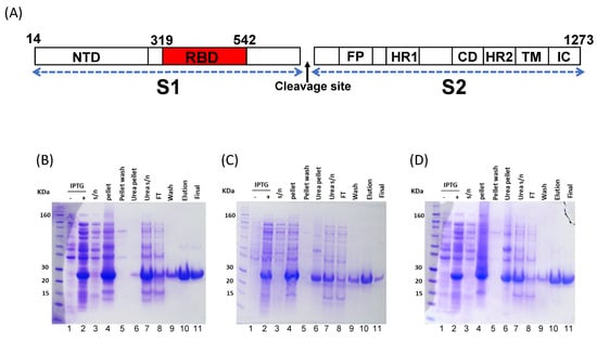 An overview of the domain organization of SARS-CoV-2′s RBD and its purification from the E. coli expression system. (A) Domain architecture of the spike (S) protein of SARS-CoV-2 (not to scale). The subdomain 1 (S1) contains the N-terminal domain (NTD, a.a. 14−305) and the receptor binding domain (RBD, a.a. 319−542). The receptor binding motif (a.a. 438−506) is contained within the RBD. Subdomain 2 (S2) contains the fusion peptide (FP) and two heptad repeats (HR1, a.a. 908 −985; HR2, a.a 1163−1214), which are separated by the connecting domain (CD). The S protein is anchored within the viral membrane by a transmembrane membrane helix (TM); the intracellular domain (IC) remains inside the virus. The S1 subunit is released post-cleavage during the fusion process. (B) Expression and purification of Wuhan-Hu1 variant, (C) Beta variant, and (D) Alpha variant RBDs from E. coli. Lanes 1 & 2, −/+ IPTG: whole-cell bacterial lysates; lane 3, s/n: supernatant resulting from microfluidization and centrifugation; lane 4, pellet: pellet resulting from cell lysis (inclusion body); lane 5, inclusion body wash; lane 6, pellet resulting from urea solubilisation of inclusion body; lane 7, urea solubilized inclusion body (input for Ni-NTA); lane 8, FT, flow-through from Ni-NTA; lane 9, wash Ni-NTA; lane 10, elution Ni-NTA; lane 11, final RBD product post-dialysis.