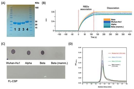 Biochemical characterization of recombinant RBD. (A) SDS-PAGE analysis of E. coli- and mammalian-derived recombinant RBDs (~26 kDa). Lane 1: Wuhan-Hu1 variant; lane 2: Alpha variant; lane 3: Beta variant; lane 4: mammalian-expressed Beta variant (~30 kDa). (B) RBD functionality determined by association to the human-ACE2 receptor using BLI analysis. (C) Dot blot of E. coli- and mammalian-produced RBDs using the SARS-CoV-1 anti-RBD antibody, CR3022. Full-length P. falciparum CSP (FL-CSP) was used as the negative control. (D) Analytical size exclusion chromatography indicates that all purified RBDs were homogenous.