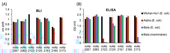 Recombinant RBDs from E. coli were next tested for the presence of epitopes corresponding to potently neutralizing Wuhan-Hu1-specific SARS-CoV-2 human mAbs by BLI and ELISA [] (Figure 3). Wuhan-Hu1 RBD produced in E. coli reacted with all 7 mAbs specific to different sites on the RBD (Figure 3A,C). The Alpha variant reacted broadly with the queried mAbs apart from WRAIR-2123, to which it displayed attenuated reactivity due to mutations in the target epitope []. E. coli- and mammalian-expressed Beta RBD reacted with mAbs WRAIR-2057, -2063, -2125, and -2151, but not mAbs WRAIR-2123, -2165 and -2173, which was also consistent with previous binding and neutralization analyses []. These observations suggest that E. coli and mammalian RBDs contain both variant-specific and cross-reactive mAb epitopes whose recognition is not impacted by protein glycosylation. The above-described trends in mAb reactivity observed by BLI were recapitulated by ELISA (Figure 3B).