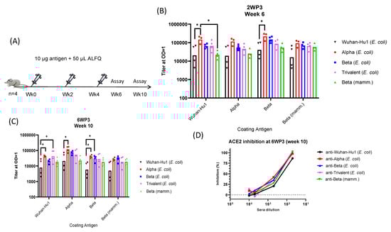 Immunogenicity of recombinant RBDs. (A) Schematic of the mouse study design. (B) ELISA (OD = 1 titer) against Wuhan-Hu1, Alpha, and Beta coat antigens at 2WP3 (week 6) and at (C) 6WP3 (week 10) are shown. Individual mouse titers are indicated for each vaccine group (E. coli Wuhan-Hu1, black inverted triangles; E. coli Alpha, red circles; E. coli Beta, blue squares; trivalent, pink diamonds; mammalian Beta, green triangles), while geometric mean titers are indicated by each bar. (D) Inhibition of homologous RBD binding to human ACE2 by serum pool collected at week 10 (6WP3). Inhibitions are relative to inhibition by normal mouse serum at a 1:50 dilution (adjusted to 0%; not plotted). Significant p-values between groups are shown with * (p < 0.05).