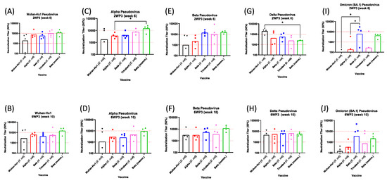 Pseudovirus neutralization titers induced by vaccination with recombinant RBDs. Individual mouse ID50 titers are indicated for each vaccine group (E. coli Wuhan-Hu1, black inverted triangles; E. coli Alpha, red circles; E. coli Beta, blue squares; trivalent, pink diamonds; mammalian Beta, green triangles), while geometric mean titers are indicated by each bar. Mouse sera at week 6 (2WP3, top panels) and week 10 (6WP3, bottom panels) were tested in pseudovirus neutralization assays against Wuhan-Hu1 (A,B), Alpha (C,D), Beta (E,F), Delta (G,H), and Omicron BA.1 (I,J) pseudoviruses. Pre-immune sera showed ID50 titers <40 across all pseudoviruses (not plotted). Significant p-values between groups are shown with * (p < 0.05).