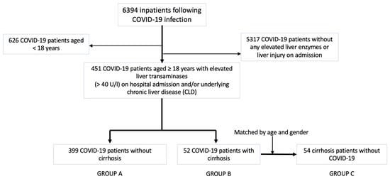 We performed a retrospective multicentre study by reviewing data of COVID-19 patients hospitalized in several centres of Semmelweis University between March 2020 and May 2022. Diagnosis of SARS-CoV-2 required a positive reverse transcription-polymerase chain reaction (RT-PCR, SEQONCE qPCR Multi Kit, IVD) test on nasopharyngeal swabs based on the protocol by the World Health Organization [15]. Furthermore, High-Resolution Computer Tomography (HRCT, Phillips Incisive 128) was used on admission for the initial diagnosis of COVID-19 pneumonia. A total of 6394 COVID-19 patients were recruited for our analysis. Inclusion and exclusion criteria are listed in Table 1. We included 451 COVID-19 patients aged ≥ 18 years with elevated liver transaminases (>40 U/L) on hospital admission and/or underlying chronic liver disease (CLD) in the medical history. Patients with CLD were identified as cirrhosis cases. Diagnosis of liver cirrhosis was previously confirmed with liver biopsy, liver elastography, clinical presentation of portal hypertension (e.g., gastrointestinal varices on endoscopy), severity scoring systems (e.g., Child–Turcette–Pugh score) and radiomorphological findings (e.g., ascites, liver surface nodularity). Of 451 COVID-19 patients, we selected 399 COVID-19 patients without liver cirrhosis (GROUP A) and 52 COVID-19 patients with cirrhosis (GROUP B) and compared them with each other according to patient characteristics and vaccination status on admission. Thus, GROUP B patients were matched with 54 cirrhosis patients without COVID-19 infection (GROUP C) with respect to age and gender (Figure 1). The matching ratio was very close to 1:1. The representation of patients in cirrhosis groups was proportional. The cirrhosis controls without COVID-19 cohort included all laboratory-confirmed SARS-CoV-2 negative, adult patients who were previously diagnosed with liver cirrhosis and were admitted to the participating centres due to deterioration in cirrhosis stage between March 2020 and May 2022. We excluded patients with ambiguous diagnosis of liver cirrhosis or SARS-CoV-2 status not tested with RT-PCR. Furthermore, COVID-19 patients without liver injury on admission were excluded from the study.