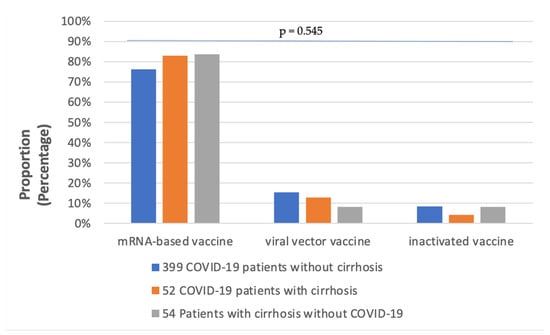 A total of 505 patients were distributed into three groups in this study. Patient characteristics are summarized in Table 2. Regarding gender, diabetes, hypertension, renal disease and cardiac disease, there were no significant differences between the three groups. However, the prevalence of cancer as a comorbidity was significantly higher in patients with cirrhosis compared to those without cirrhosis, with hepatocellular carcinoma (HCC) accounting for most cancer cases. Half of the 451 COVID-19 infected patients (227) were current smokers, and the proportion of smokers was found to be significantly different between the three groups. Ninety percent of all patients (453/505) received primary vaccination. As illustrated in Figure 2, mRNA-based COVID-19 vaccines were the most frequently administered in all three groups, particularly in GROUP B and GROUP C, but the rate of viral vector vaccination was higher in GROUP B than in GROUP C (11.5% vs. 7.4%).