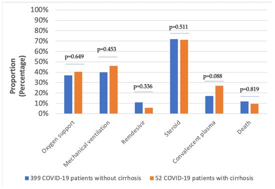 - Ge, J.; Pletcher, M.J.; Lai, J.C. Outcomes of SARS-CoV-2 Infection in Patients With Chronic Liver Disease and Cirrhosis: A National COVID Cohort Collaborative Study. Gastroenterology 2021, 161, 1487–1501.e5. [Google Scholar] [CrossRef]