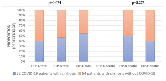 Proportion of different Child–Turcette–Pugh (CTP) stages in all and deceased patients with cirrhosis. There were no CTP-A deceased cases in both groups. The severity of liver cirrhosis was classified by CTP Score.