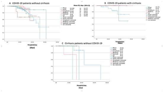 Kaplan–Meier survival curves displaying the estimated survival probabilities in the three groups (A–C) stratified by different COVID-19 vaccines. Mean overall survival (OS) and 95% confidence intervals (95% CI) are included, where appropriate. (A) In COVID-19 patients without cirrhosis, Sputnik-V was associated with significantly lower survival rates compared to Moderna (log-rank test: p = 0.039). (B) In COVID-19 patients with cirrhosis, AstraZeneca was less effective to prevent COVID-19-related deaths in contrast to Moderna (log-rank test: p = 0.157). (C) Patients receiving Pfizer-BioNTech had significantly better survival rates compared to those receiving Moderna (log-rank test: p = 0.017).