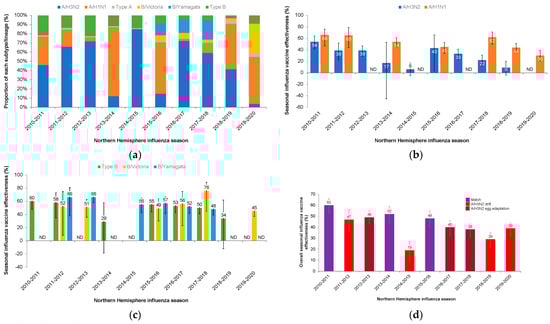 Seasonal influenza vaccine effectiveness in the US as estimated by the Centers for Disease Control and Prevention (CDC) [15,16,17,18,19,20,21,22,23,24,25]. (a) Proportions of identified virus types, subtypes, and lineages by year. (b) Adjusted vaccine effectiveness for influenza A strains. (c) Adjusted vaccine effectiveness for influenza B strains. (d) Adjusted overall seasonal effectiveness. Error bars for (b–d) indicate adjusted 95% confidence interval. ND, no data.