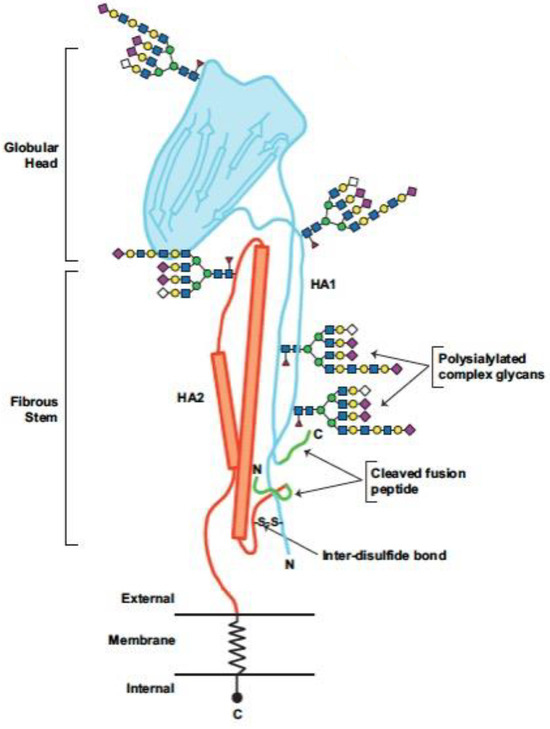 Glycosylation (or the addition of carbohydrates known as glycans to the functional groups of molecules) is necessary for protein folding across phyla. In viruses, mutations that create new N-glycosylation sites in the HA1 globular domain (Figure 3) commonly occur in response to host immune responses. HA2 is more conserved, with a lower mutation rate, than HA1. Since their first appearances in 1918 and 1968, respectively, A/H1N1 and A/H3N2 have acquired glycans in the globular head and stem regions of the HA molecule. Over time, the addition of more and more complex glycosylation sites shields antigenic sites, often neutralizing host antibodies. Depending on their location, the additional glycans may also make the HA more susceptible to lectin-based host defense systems [63,64,65].