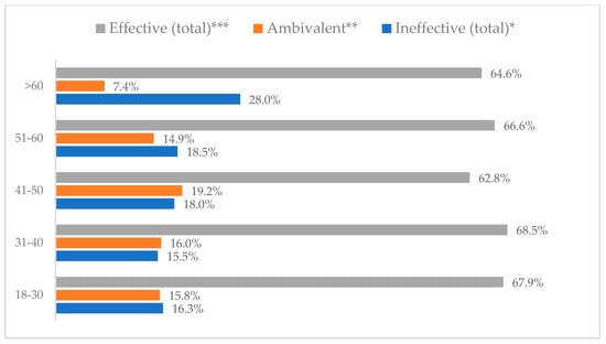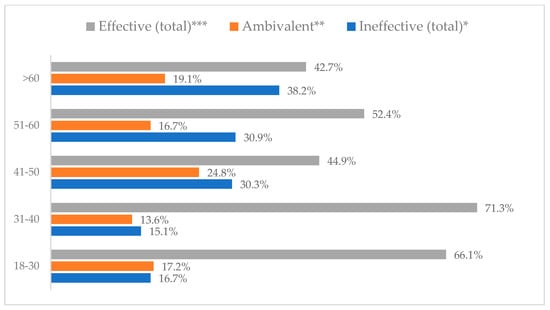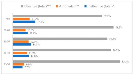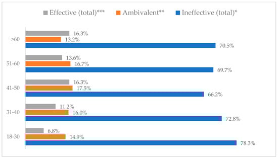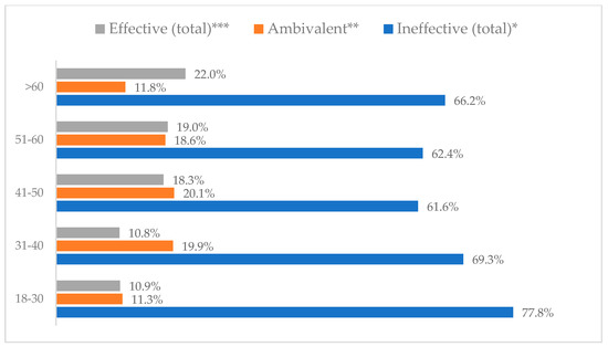 Avoiding contact with sick people to prevent influenza virus infection by age (N = 905). * Sum of responses: completely ineffective, ineffective, rather ineffective; ** Response: neither ineffective nor effective; *** Sum of responses: rather effective, effective, completely effective.