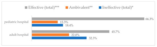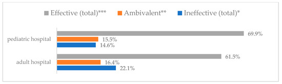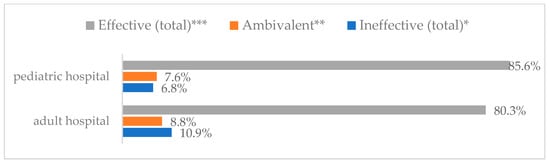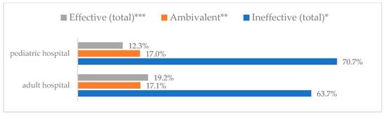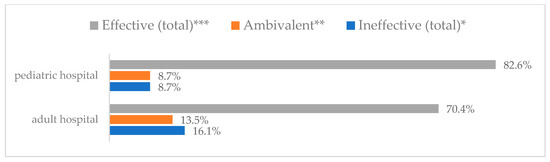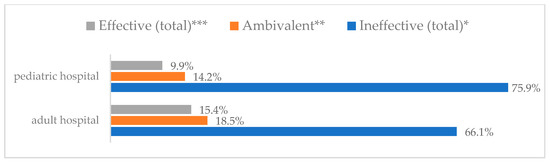 Avoiding contact with sick people to prevent influenza virus infection by type of hospital (N = 905). * Sum of responses: completely ineffective, ineffective, rather ineffective; ** Response: neither ineffective nor effective; *** Sum of responses: rather effective, effective, completely effective.