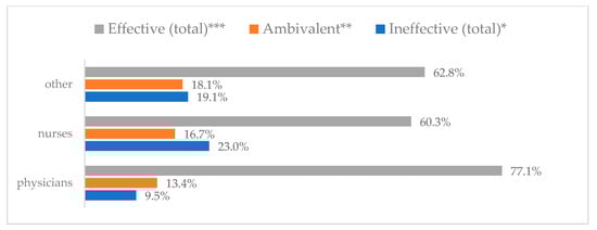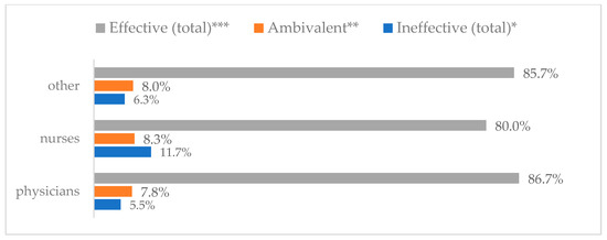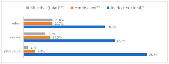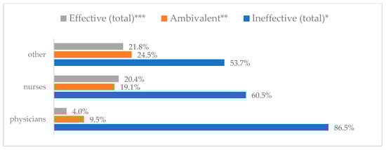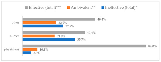 Avoiding contact with sick people to prevent influenza virus infection by profession (N = 905). * Sum of responses: completely ineffective, ineffective, rather ineffective; ** Response: neither ineffective nor effective; *** Sum of responses: rather effective, effective, completely effective.
