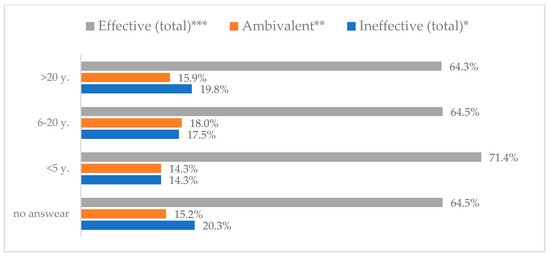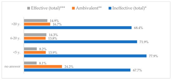 Taking vitamin C daily to prevent influenza virus infection by seniority (N = 905). * Sum of responses: completely ineffective, ineffective, rather ineffective; ** Response: neither ineffective nor effective; *** Sum of responses: rather effective, effective, completely effective.