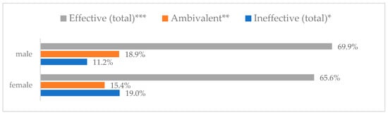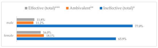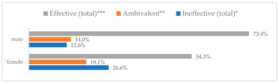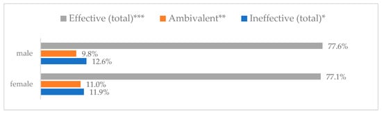 Avoiding contact with sick people to prevent influenza virus infection by gender (N = 905). * Sum of responses: completely ineffective, ineffective, rather ineffective; ** Response: neither ineffective nor effective; *** Sum of responses: rather effective, effective, completely effective.