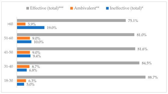 Wearing a protective mask that covers the mouth and nose to prevent influenza virus infection by age (N = 905). * Sum of responses: completely ineffective, ineffective, rather ineffective; ** Response: neither ineffective nor effective; *** Sum of responses: rather effective, effective, completely effective.