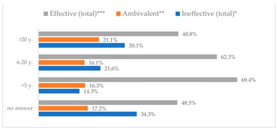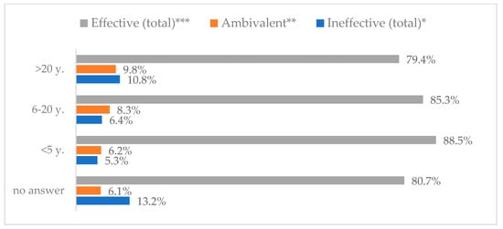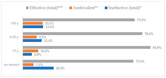 Influenza vaccination to prevent influenza virus infection by seniority (N = 905). * Sum of responses: completely ineffective, ineffective, rather ineffective; ** Response: neither ineffective nor effective; *** Sum of responses: rather effective, effective, completely effective.