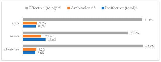 Influenza vaccination to prevent influenza virus infection by profession (N = 905). * Sum of responses: completely ineffective, ineffective, rather ineffective; ** Response: neither ineffective nor effective; *** Sum of responses: rather effective, effective, completely effective.
