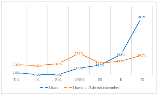 Attitudes toward influenza vaccination to prevent influenza virus infection among vaccinated and unvaccinated against influenza (N = 950). Note. TIN-totally ineffective, IN-ineffective, RIN-rather ineffective, NINE-neither ineffective nor effective, RE-rather effective, E-effective, TE-totally effective.