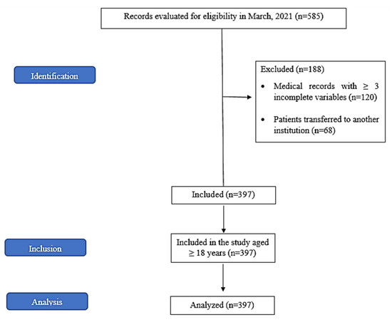 Overall, 585 medical records were evaluated for eligibility in March 2021; of these, 188 were excluded (Figure 1). Thus, 397 patients admitted to the ICU with SARS due to COVID-19 and in need of IMV participated in this study. Of these, 59.70% were men with a mean age of 61.04 ± 0.76 years (range 20–111 years). Of the patients aged >60 years, 62.17% were men and 37.83% were women.