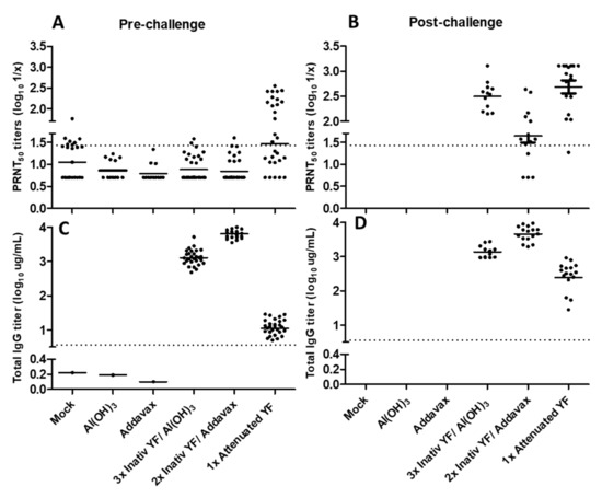 Immunogenicity of different inactivated YF 17DD virus formulations. Neutralizing antibodies titers in pre-(A) and post-challenge (B) times. Total IgG titers in pre-(C) and post-challenge (D) times. Data considering PRNT50 cut off = 1,43 and ELISA IgG cut off = 0.56. Animals from negative control groups died after the challenge, so their post-challenge antibody titers were not measured. (A): non normal data; p < 0.0001 by Kruskal–Wallis test. (B–D): all groups presented normal data; p < 0.0001 by one-way ANOVA.