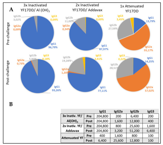 However, AddaVax®-based formulation also induced high titer of IgG2b (25,600), in comparison with the other formulations (titers of 6400 and 800 induced by inactivated YF 17DD/Al(OH)3 and attenuated YF 17DD, respectively). After challenge, AddaVax®-based formulation achieved the range of 51,200 of IgG2b titer, against titers of 12,800 induced by alum formulation. IgG2b is the second more neutralizing potent. IgG subtypes balance are described in Figure 2.